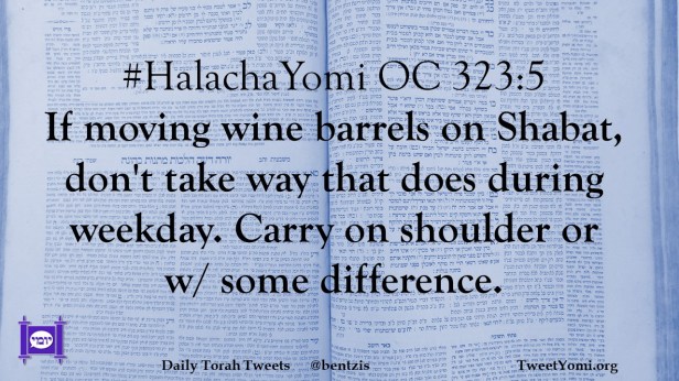 #HalachaYomi OC 323:5 If moving wine barrels on Shabat, don’t take way that does during weekday. Carry on shoulder or w/ some difference.