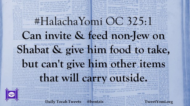 #HalachaYomi OC 325:1 Can invite & feed non-Jew on Shabat & give him food to take, but can’t give him other items that will carry outside.