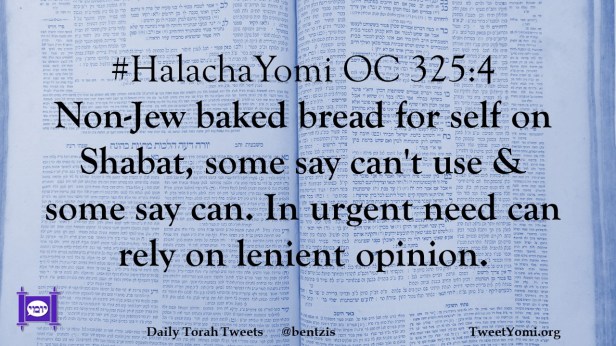 #HalachaYomi OC 325:4 Non-Jew baked bread for self on Shabat, some say can’t use & some say can. In urgent need can rely on lenient opinion.