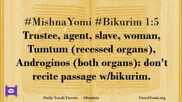 #MishnaYomi #Bikurim 1:5 Trustee, agent, slave, woman, Tumtum (recessed organs), Androginos (both organs): don’t recite passage w/bikurim.