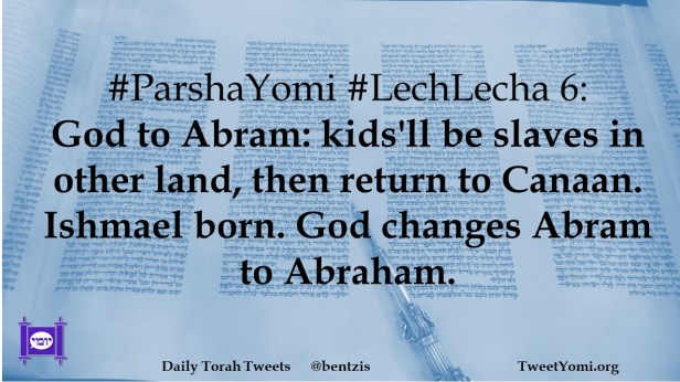 #ParshaYomi #LechLecha 6: God to Abram: kids’ll be slaves in other land, then return to Canaan. Ishmael born. God changes Abram to Abraham.