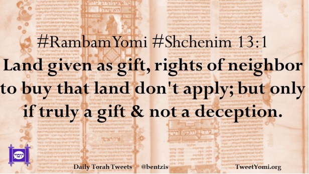 #RambamYomi #Shchenim 13:1 Land given as gift, rights of neighbor to buy that land don’t apply; but only if truly a gift & not a deception.