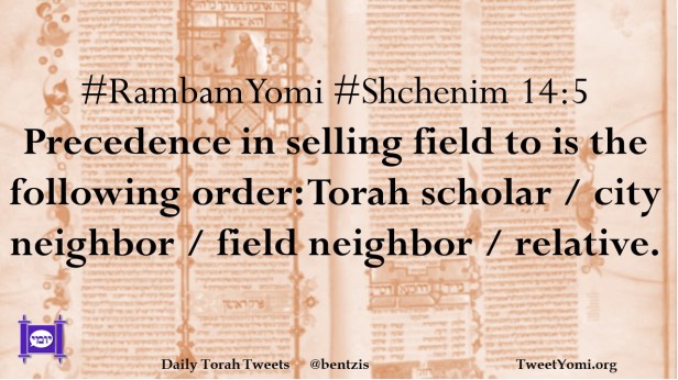 #RambamYomi #Shchenim 14:5 Precedence in selling field to is the following order: Torah scholar / city neighbor / field neighbor / relative.