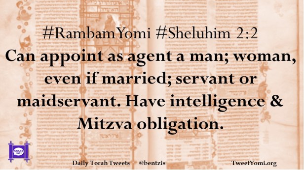#RambamYomi #Sheluhim 2:2 Can appoint as agent a man; woman, even if married; servant or maidservant. Have intelligence & Mitzva obligation.
