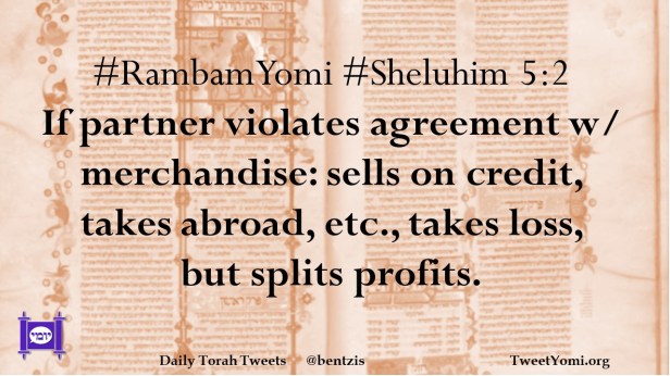 #RambamYomi #Sheluhim 5:2 If partner violates agreement w/ merchandise: sells on credit, takes abroad, etc., takes loss, but splits profits.
