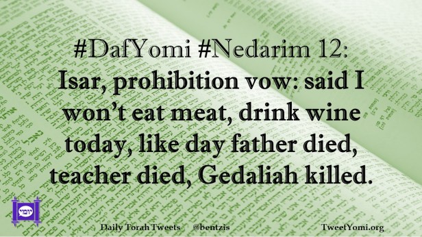 DafYomi, Nedarim #DafYomi #Nedarim 12 Date: February 15, 2023Author: netanelspitz #DafYomi #Nedarim 12: Isar, prohibition vow: said I won’t eat meat, drink wine today, like day father died, teacher died, Gedaliah killed. Share this: Share on X (Opens in new window) X Share on Facebook (Opens in new window) Facebook Like Loading... Related