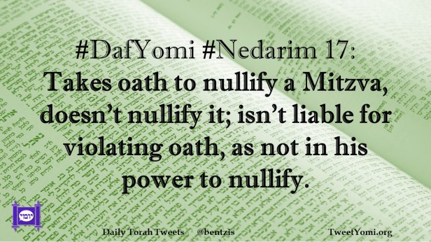 DafYomi, Nedarim #DafYomi #Nedarim 17 Date: February 15, 2023Author: netanelspitz #DafYomi #Nedarim 17: Takes oath to nullify a Mitzva, doesn’t nullify it; isn’t liable for violating oath, as not in his power to nullify. Share this: Share on X (Opens in new window) X Share on Facebook (Opens in new window) Facebook Like Loading... Related