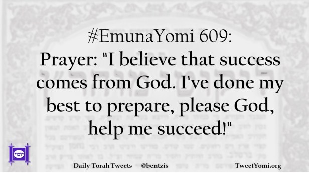 EmunaYomi #EmunaYomi 609 Date: February 15, 2023Author: netanelspitz #EmunaYomi 609: Prayer: “I believe that success comes from God. I’ve done my best to prepare, please God, help me succeed!” Share this: Share on X (Opens in new window) X Share on Facebook (Opens in new window) Facebook Like Loading... Related