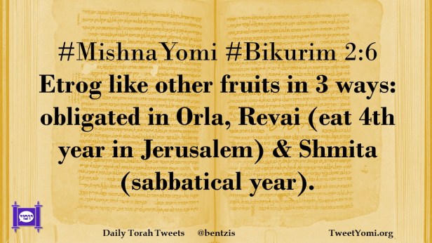 #MishnaYomi #Bikurim 2:6 Etrog like other fruits in 3 ways: obligated in Orla, Revai (eat 4th year in Jerusalem) & Shmita (sabbatical year).
