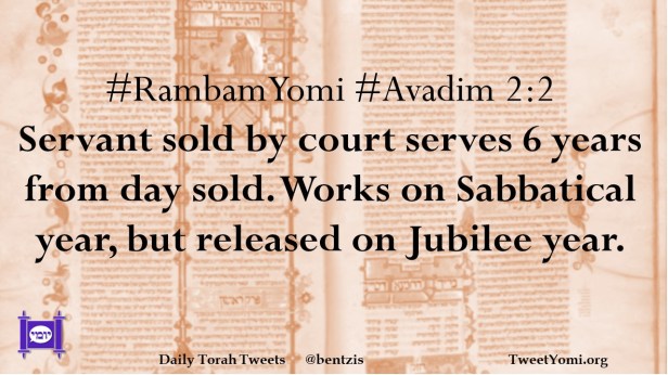 #RambamYomi #Avadim 2:2 Servant sold by court serves 6 years from day sold. Works on Sabbatical year, but released on Jubilee year.