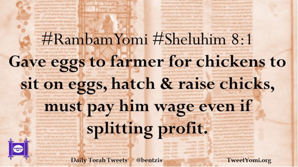 #RambamYomi #Sheluhim 8:1 Gave eggs to farmer for chickens to sit on eggs, hatch & raise chicks, must pay him wage even if splitting profit.