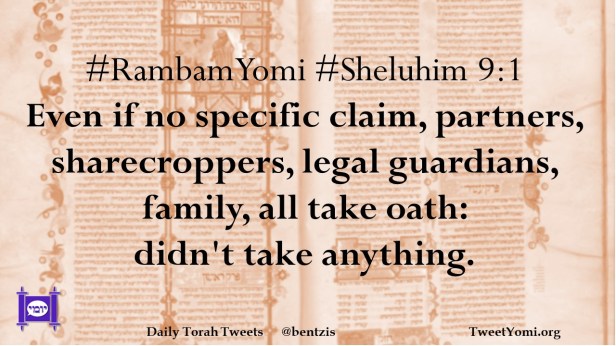 #RambamYomi #Sheluhim 9:1 Even if no specific claim, partners, sharecroppers, legal guardians, family, all take oath: didn’t take anything.