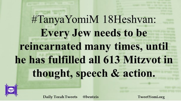 #TanyaYomiM 18Heshvan: Every Jew needs to be reincarnated many times, until he has fulfilled all 613 Mitzvot in thought, speech & action.