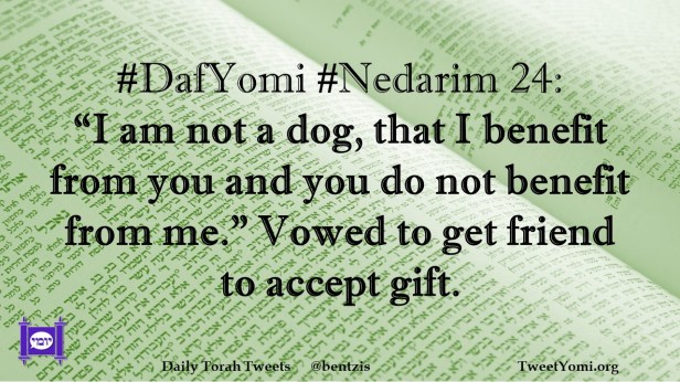 DafYomi, Nedarim #DafYomi #Nedarim 24 Date: February 16, 2023Author: netanelspitz #DafYomi #Nedarim 24: “I am not a dog, that I benefit from you and you do not benefit from me.” Vowed to get friend to accept gift. Share this: Share on X (Opens in new window) X Share on Facebook (Opens in new window) Facebook Like Loading... Related