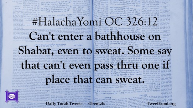 #HalachaYomi OC 326:12 Can’t enter a bathhouse on Shabat, even to sweat. Some say that can’t even pass thru one if place that can sweat.