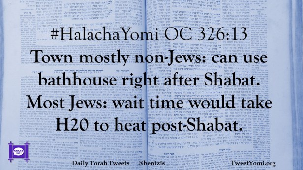#HalachaYomi OC 326:13 Town mostly non-Jews: can use bathhouse right after Shabat. Most Jews: wait time would take H20 to heat post-Shabat.