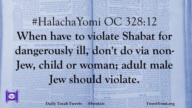 #HalachaYomi OC 328:12 When have to violate Shabat for dangerously ill, don’t do via non-Jew, child or woman; adult male Jew should violate.