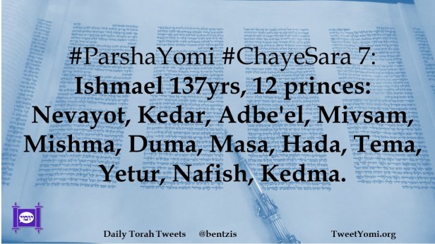 #ParshaYomi #ChayeSara 7: Ishmael 137yrs, 12 princes: Nevayot, Kedar, Adbe’el, Mivsam, Mishma, Duma, Masa, Hada, Tema, Yetur, Nafish, Kedma.