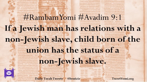 #RambamYomi #Avadim 9:1 If a Jewish man has relations with a non-Jewish slave, child born of the union has the status of a non-Jewish slave.