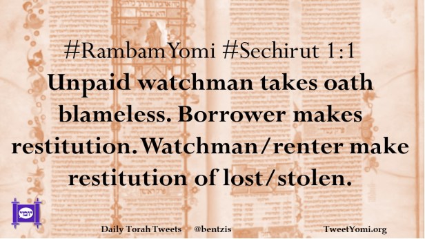 #RambamYomi #Sechirut 1:1 Unpaid watchman takes oath blameless. Borrower makes restitution. Watchman/renter make restitution of lost/stolen.
