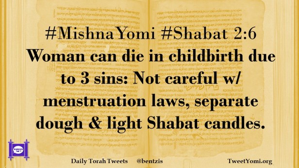 #MishnaYomi #Shabat 2:6 Woman can die in childbirth due to 3 sins: Not careful w/ menstruation laws, separate dough & light Shabat candles.