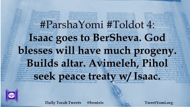 #ParshaYomi #Toldot 4: Isaac goes to BerSheva. God blesses will have much progeny. Builds altar. Avimeleh, Pihol seek peace treaty w/ Isaac.
