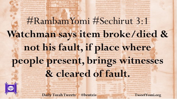 #RambamYomi #Sechirut 3:1 Watchman says item broke/died & not his fault, if place where people present, brings witnesses & cleared of fault.
