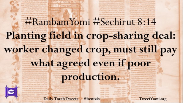 #RambamYomi #Sechirut 8:14 Planting field in crop-sharing deal: worker changed crop, must still pay what agreed even if poor production.
