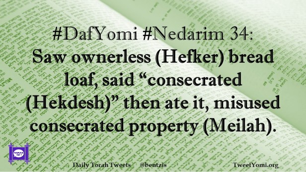 DafYomi, Nedarim #DafYomi #Nedarim 34 Date: February 20, 2023Author: netanelspitz #DafYomi #Nedarim 34: Saw ownerless (Hefker) bread loaf, said “consecrated (Hekdesh)” then ate it, misused consecrated property (Meilah). Share this: Share on X (Opens in new window) X Share on Facebook (Opens in new window) Facebook Like Loading... Related