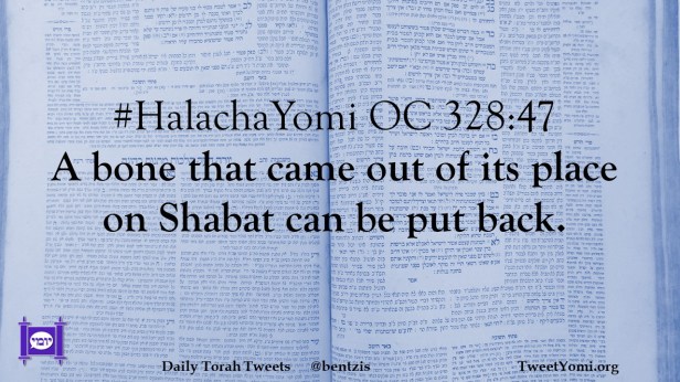 HalachaYomi #HalachaYomi OC 328:47 Date: February 20, 2023Author: netanelspitz #HalachaYomi OC 328:47 A bone that came out of its place on Shabat can be put back. Share this: Share on X (Opens in new window) X Share on Facebook (Opens in new window) Facebook Like Loading... Related