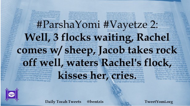 #ParshaYomi #Vayetze 2: Well, 3 flocks waiting, Rachel comes w/ sheep, Jacob takes rock off well, waters Rachel’s flock, kisses her, cries.