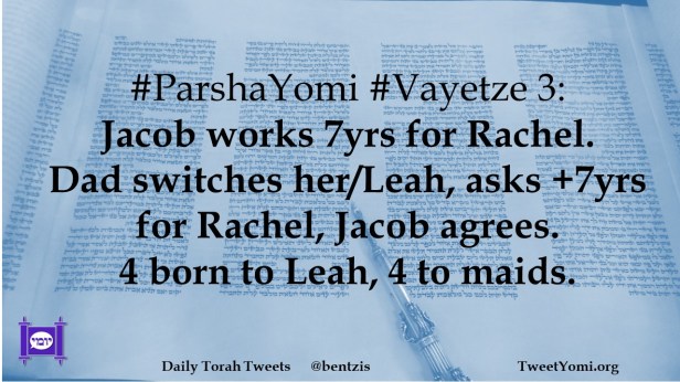 #ParshaYomi #Vayetze 3: Jacob works 7yrs for Rachel. Dad switches her/Leah, asks +7yrs for Rachel, Jacob agrees. 4 born to Leah, 4 to maids.