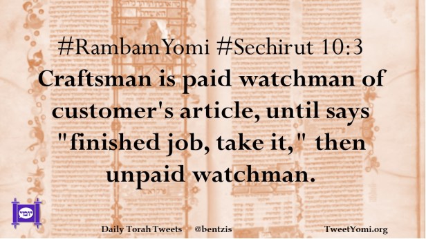 #RambamYomi #Sechirut 10:3 Craftsman is paid watchman of customer’s article, until says “finished job, take it,” then unpaid watchman.