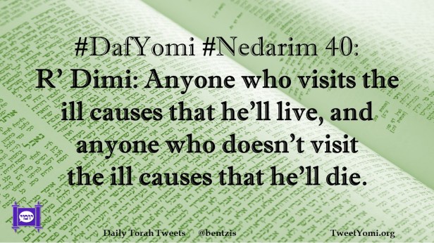 DafYomi, Nedarim #DafYomi #Nedarim 40 Date: February 22, 2023Author: netanelspitz #DafYomi #Nedarim 40: R’ Dimi: Anyone who visits the ill causes that he’ll live, and anyone who doesn’t visit the ill causes that he’ll die. Share this: Share on X (Opens in new window) X Share on Facebook (Opens in new window) Facebook Like Loading... Related