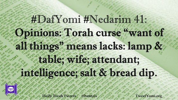 DafYomi, Nedarim #DafYomi #Nedarim 41 Date: February 22, 2023Author: netanelspitz #DafYomi #Nedarim 41: Opinions: Torah curse “want of all things” means lacks: lamp & table; wife; attendant; intelligence; salt & bread dip. Share this: Share on X (Opens in new window) X Share on Facebook (Opens in new window) Facebook Like Loading... Related