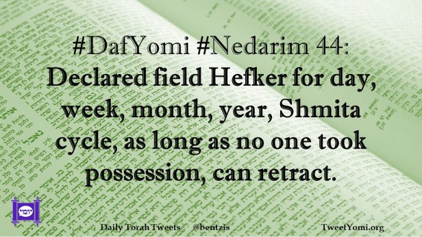 DafYomi, Nedarim #DafYomi #Nedarim 44 Date: February 22, 2023Author: netanelspitz #DafYomi #Nedarim 44: Declared field Hefker for day, week, month, year, Shmita cycle, as long as no one took possession, can retract. Share this: Share on X (Opens in new window) X Share on Facebook (Opens in new window) Facebook Like Loading... Related