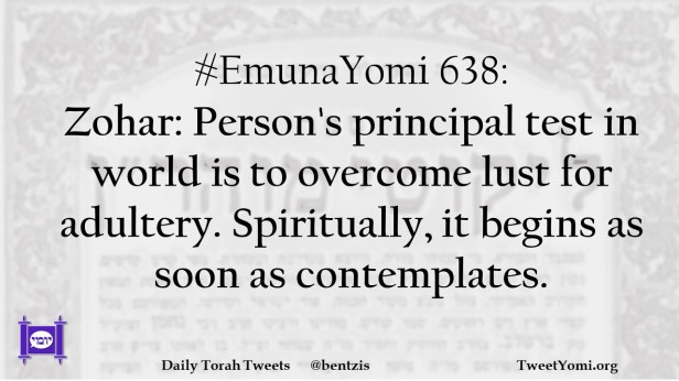 #EmunaYomi 638: Zohar: Person’s principal test in world is to overcome lust for adultery. Spiritually, it begins as soon as contemplates.