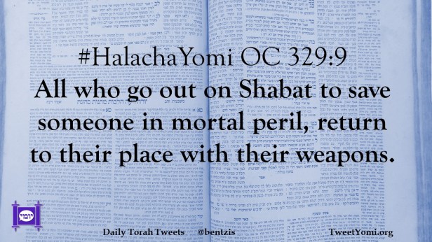 HalachaYomi #HalachaYomi OC 329:9 Date: February 22, 2023Author: netanelspitz #HalachaYomi OC 329:9 All who go out on Shabat to save someone in mortal peril, return to their place with their weapons. Share this: Share on X (Opens in new window) X Share on Facebook (Opens in new window) Facebook Like Loading... Related