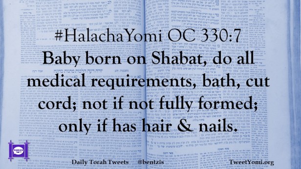 #HalachaYomi OC 330:7 Baby born on Shabat, do all medical requirements, bath, cut cord; not if not fully formed; only if has hair & nails.