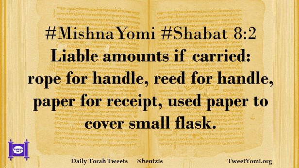 #MishnaYomi #Shabat 8:2 Liable amounts if carried: rope for handle, reed for handle, paper for receipt, used paper to cover small flask.