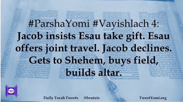 #ParshaYomi #Vayishlach 4: Jacob insists Esau take gift. Esau offers joint travel. Jacob declines. Gets to Shehem, buys field, builds altar.