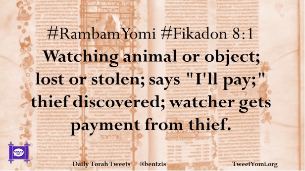 #RambamYomi #Fikadon 8:1 Watching animal or object; lost or stolen; says “I’ll pay;” thief discovered; watcher gets payment from thief.