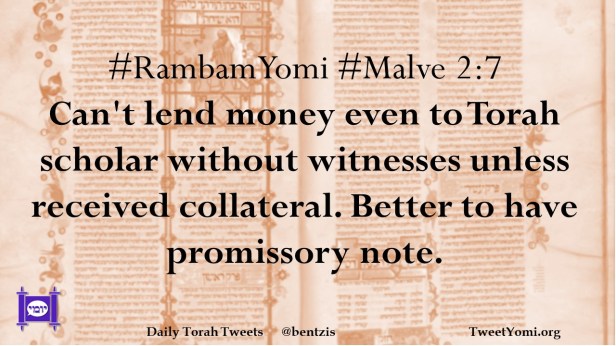 #RambamYomi #Malve 2:7 Can’t lend money even to Torah scholar without witnesses unless received collateral. Better to have promissory note.
