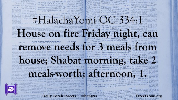 #HalachaYomi OC 334:1 House on fire Friday night, can remove needs for 3 meals from house; Shabat morning, take 2 meals-worth; afternoon, 1.