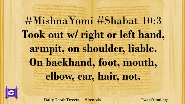 #MishnaYomi #Shabat 10:3 Took out w/ right or left hand, armpit, on shoulder, liable. On backhand, foot, mouth, elbow, ear, hair, not.
