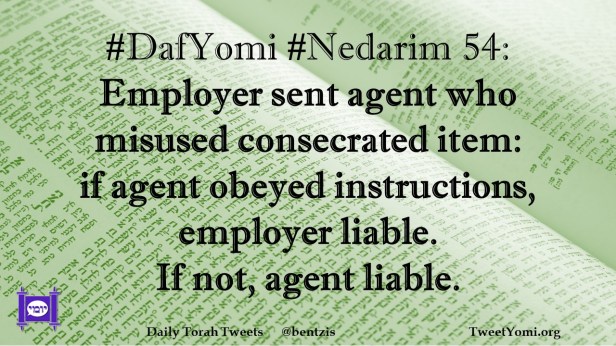 DafYomi, Nedarim #DafYomi #Nedarim 54 Date: February 26, 2023Author: netanelspitz #DafYomi #Nedarim 54: Employer sent agent who misused consecrated item: if agent obeyed instructions, employer liable. If not, agent liable. Share this: Share on X (Opens in new window) X Share on Facebook (Opens in new window) Facebook Like Loading... Related