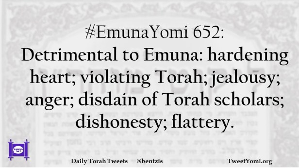 #EmunaYomi 652: Detrimental to Emuna: hardening heart; violating Torah; jealousy; anger; disdain of Torah scholars; dishonesty; flattery.