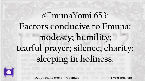 EmunaYomi #EmunaYomi 653 Date: February 26, 2023Author: netanelspitz #EmunaYomi 653: Factors conducive to Emuna: modesty; humility; tearful prayer; silence; charity; sleeping in holiness. Share this: Share on X (Opens in new window) X Share on Facebook (Opens in new window) Facebook Like Loading... Related