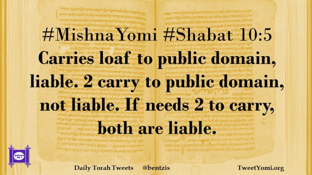 #MishnaYomi #Shabat 10:5 Carries loaf to public domain, liable. 2 carry to public domain, not liable. If needs 2 to carry, both are liable.