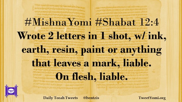 #MishnaYomi #Shabat 12:4 Wrote 2 letters in 1 shot, w/ ink, earth, resin, paint or anything that leaves a mark, liable. On flesh, liable.